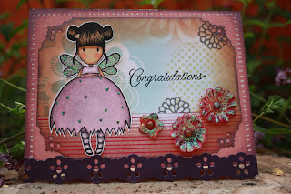 MARKERS: Yes I used 99.9% COPICS but I did use a PRISMA (Spanish Orange) for the first layer of Karen's socks. I also used a fine black SHARPIE to touch up Mink's face. Let's start with the skin! Both Leeta and Mink used a basecoat of E11 Bareley Beige with shadowing of E13 Light Suntan. Leeta also has R02 Flesh for her cheeks, a little in her brow and bust. E37 Sepia for both Leeta's darkest eye shadow and for the majority of her boots which are lo-lighted with E49 Dark Bark. Her shoulders are draped in BV00 Mauve and V95 Light Grape. Her dress is RV00 Water Lily with RV91 Grayish Cherry. The second layer of her socks is G82 Spring Dim Green. The soles of her shoes are BV23 Grayish Lavender. Trim and bow on dress are both G82 Spring Dim Green and G21 Lime Green (these colors are so similar, I would use a higher contrast next time). Leeta's hair is E13 Light Suntan. Minks Turn: Hair BG45 Nile Blue, Wings: RV00 Water Lily with RANGER CRYSTAL STICKLES on top (both the wings and on top of the waist band which is V95 Light Grape). Bumble Bee stockings are RVoo Water Lily in wide stripe and v95 Light Grape in thin stripe. Bumble Bee skirt is R85 Red Rose with v95 Early Grape (v95 Early Grape also for the bust of Bumble Bee dress with PRISMA lilac for the shadowing which I don't recommend unless you want a hard line). The butterfly dot in the the "Spring" stamp is R85 Red Rose.